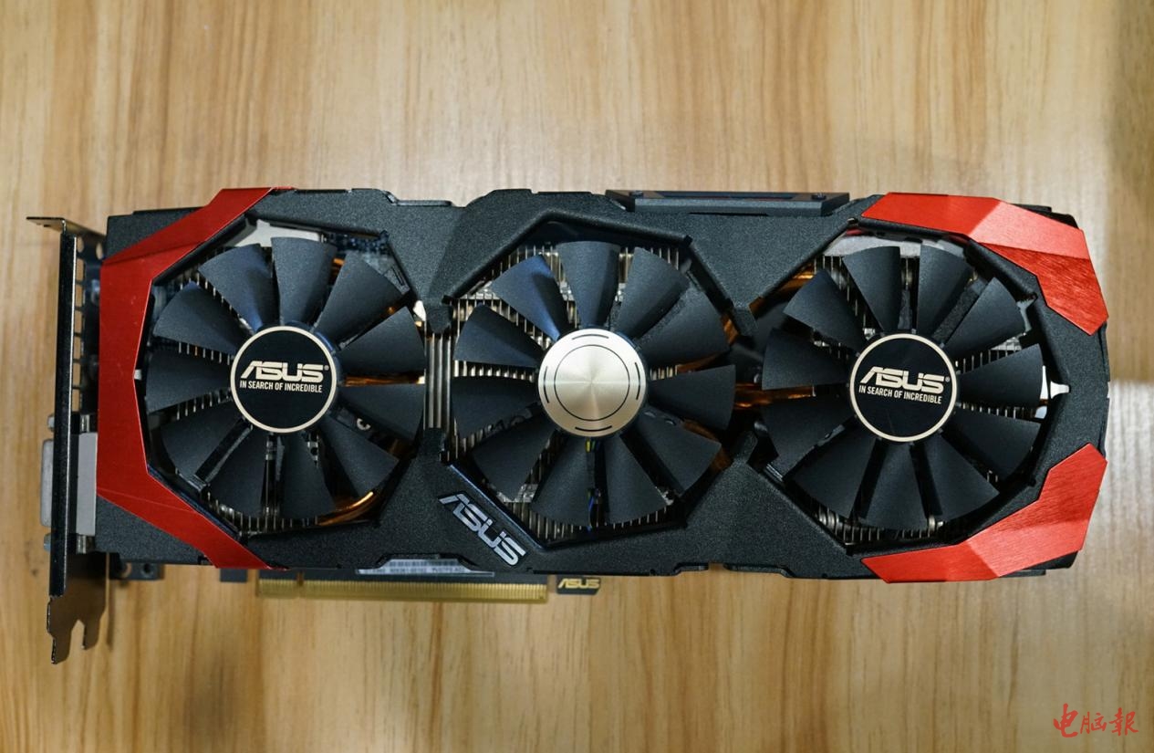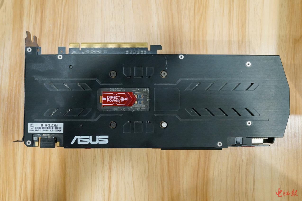 小编第一时间拿到了C哥手上那块“崭新出土”的古董显卡,经鉴别这一块上市于2015年的华硕GTX 960飓风版,由于保存(吃灰)得当,所以成色看起来还很新。显卡的外观还比较有特色,黑色磨砂处理的外壳配合三片采用拉丝工艺的红色金属片,再搭配三枚带有“ASUS”金属Logo的散热风扇,显得精致奢华,颜值并不比现在的新卡低。从沉甸甸的手感和扎实背板也可以感觉到这是一块“堆料级”显卡。