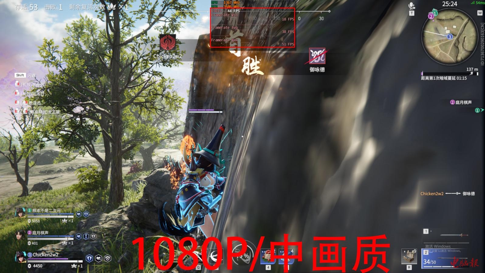 鉴于720P分辨率下的画质表现实在辣眼睛,我们还是将分辨率标准固定在1080P。在1080P/中画质设定下的帧率就处于不可玩的水平了,最高帧率仅48fps。将画质预设调为“低”的表现也很一般,最高帧率61fps,最低帧率43fps,平均帧率51fps。在排位游戏中遇上敌人话,可以分分钟让你体验“慢人一步”的快感