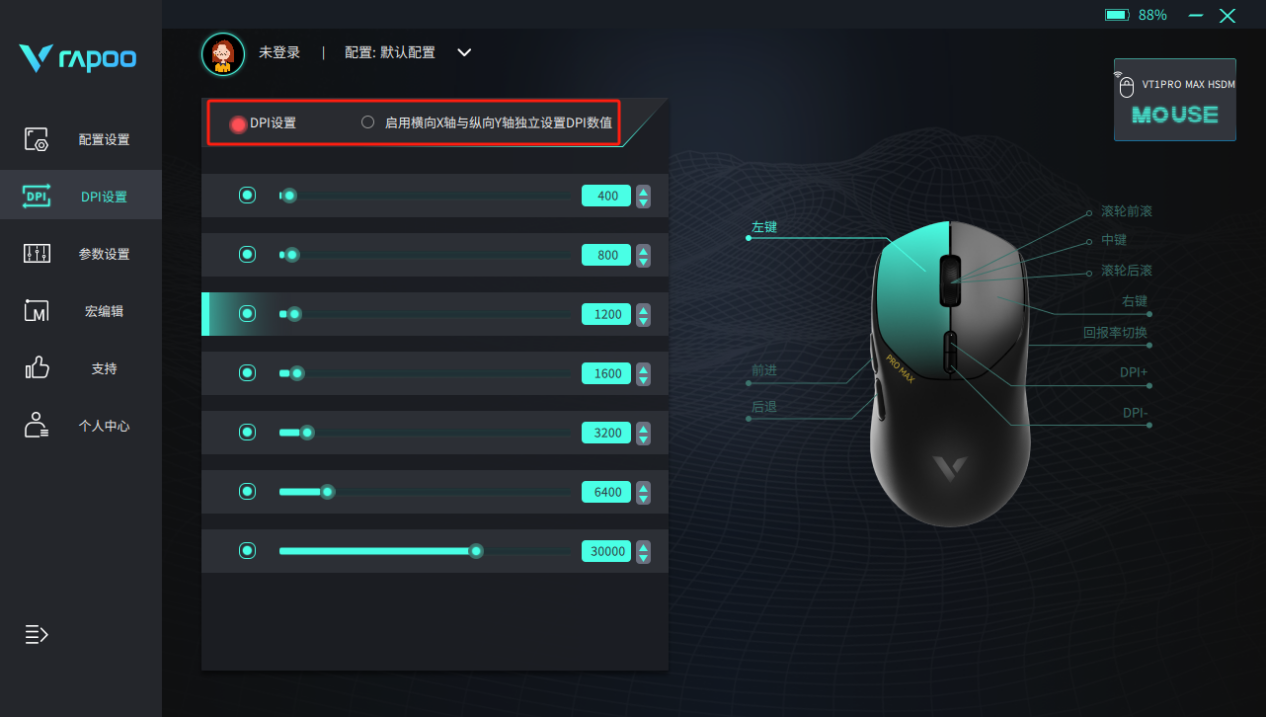 DPI:原生50-30000DPI(插频到45000)/原生50-30000DPI(插频到45000)/50-26000DPI