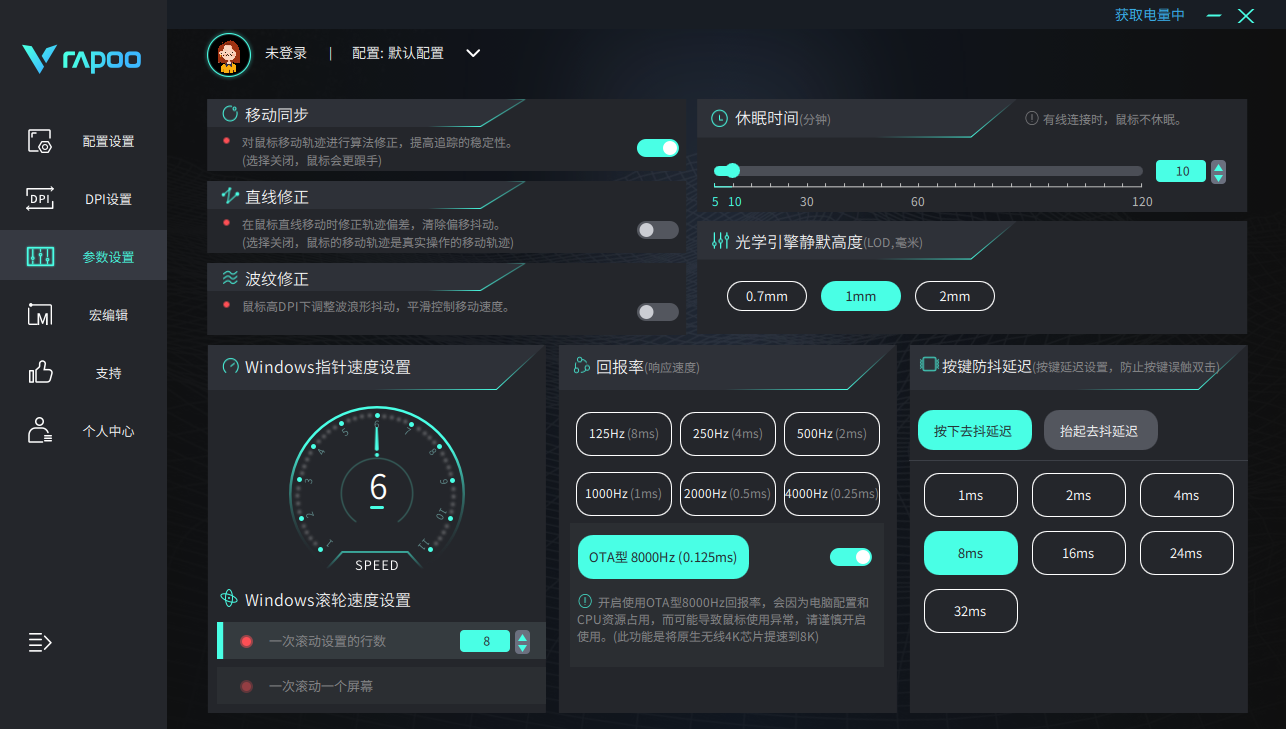 VT1系列三个型号都是有线和2.4GHz无线双模连接,在有线模式下最高回报率达到了8000Hz,无线连接时,也能实现OTA无线8000Hz的最高回报率,带来了低至0.125ms的响应时间和稳定的传输表现。同时得益于雷柏自研V+Wireless无线游戏技术,实现了堪比有线连接的0.125ms响应速度。通过搭载板载天线、自适应信号增强、变频档位调节等,实现了10米以上的使用距离和出色的抗干扰性能。