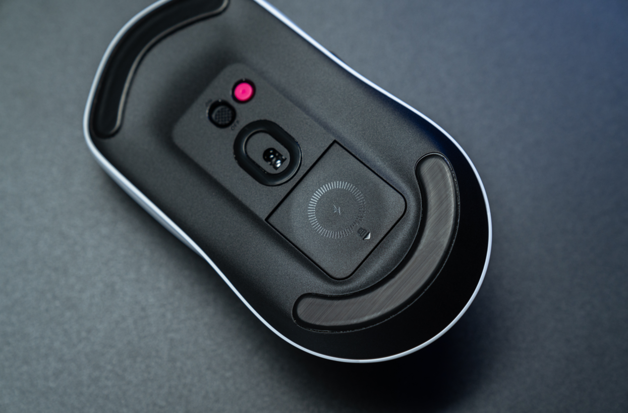 在鼠标底面设置了两块大面积的PTFE特氟龙脚垫,移动起来非常的轻巧、顺滑。同时还设置有电源开关、磁吸式接收器收纳仓等。
