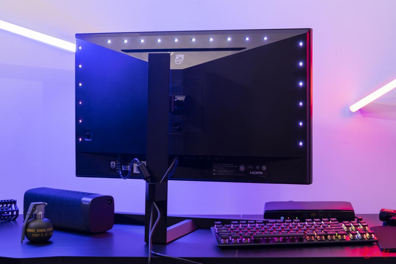 飞利浦猛腾全新M1 279M1RVE加入了Ambiglow流光溢彩技术,通过在显示器背面三边设置点状灯,玩家可以根据自己的喜好设置灯光颜色、模式,特别是光影同步和光音同步两种模式,灯光根据正在播放的音乐、图像进行变化,在提升显示器炫酷值的基础上,还能在显示器四周形成光晕,在视觉上扩展屏幕、有助于环节眼睛疲劳的效果,这在市面上的电竞显示器中可是独一份的功能哦。