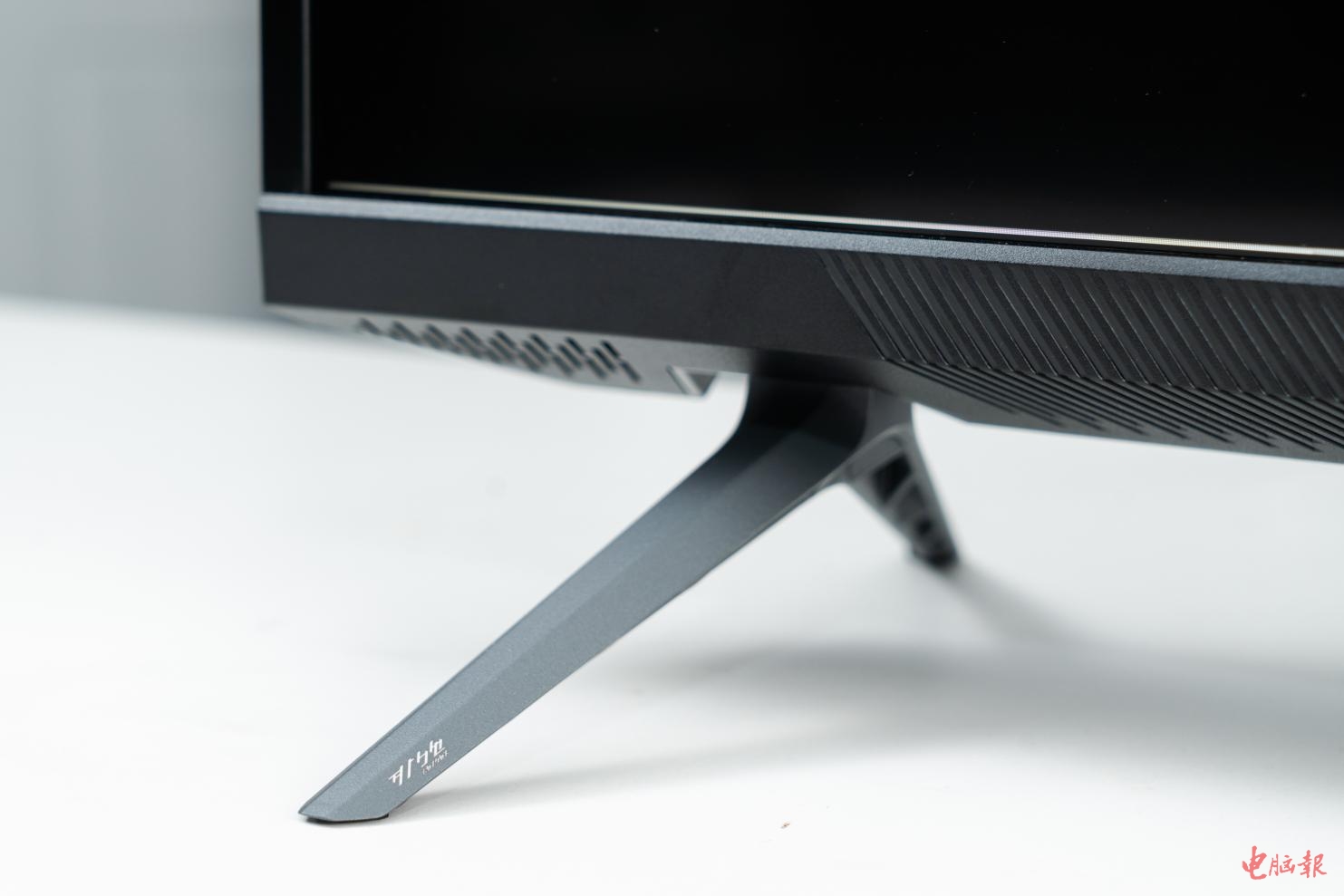 AORUS FV43U依然延续了AORUS系列电竞显示器流畅犀利的家族式外观,虽然屏幕尺寸进化到了43英寸,但其采用了三面窄边框设计,自带的倒V字形支架向外在保证支撑稳定的同时也比较纤细小巧,所以在正面观感上并不会让人觉得很厚重。显示器边框采用了质感细腻的金属拉丝装饰,而屏幕底框区域则经过了磨砂处理,两边还分布有类似散热格栅的装饰线条,外形简约而不失设计感。