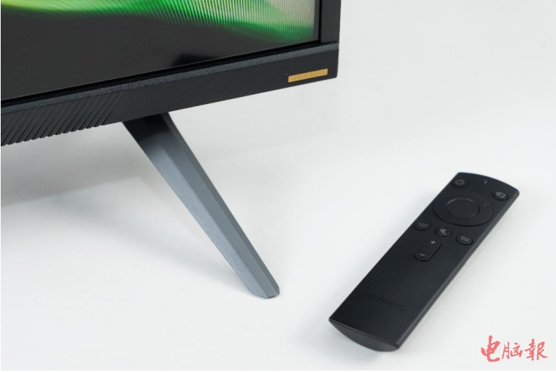 显示器背面的机甲风格十足,向两侧伸展的烤漆线条非常的霸气,透露出满满的硬朗电竞气息。屏幕中央底部是OSD摇杆,通过操纵摇杆就可以对显示器的黑平衡、输入模式、音量等进行快速设置,比较方便。当然,作为一款43英寸的超大屏显示器,它的使用场景可不仅限于电脑桌,用来当作游戏主机的显示器放在客厅也是非常合适的,为此AORUS FV43U标配了遥控器,坐在沙发上轻轻一按各种设置都能搞定。