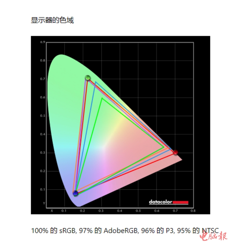 色域:97% DCI-P3、150% sRGB、99% AdobeRGB