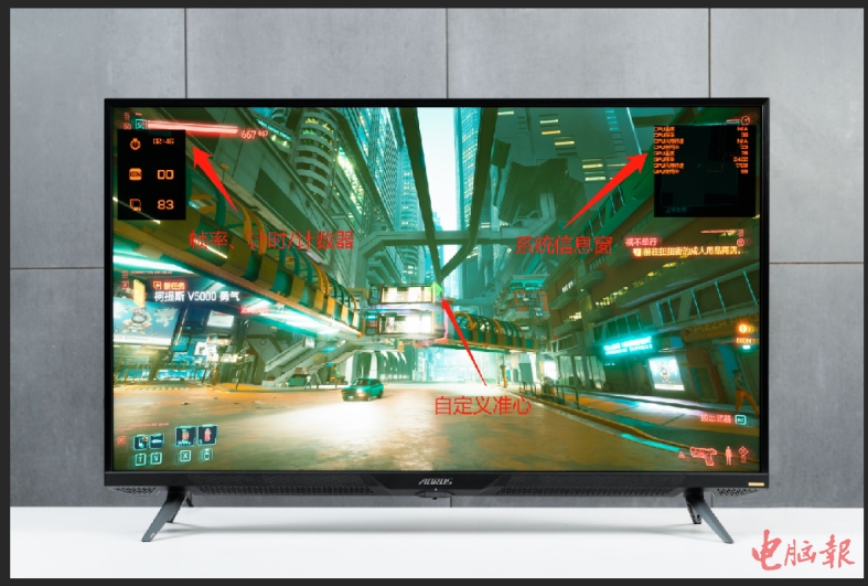 当游戏场景较暗看不清时,还可以开启黑平衡功能,显示器就能在整体亮度不变的前提下,局部调亮游戏画面中的较暗区域,让玩家看清暗部的画面,在《绝地求生》这种吃鸡游戏中,能够有效减少室内被偷袭的情况。系统信息窗则可以显示PC的硬件信息,方便玩家了解当前的运行状态。值得一提的是,AORUS FV43U提供游戏辅助功能都是基于显示器硬件层面的,无需额外的游戏插件也不会消耗硬件资源。