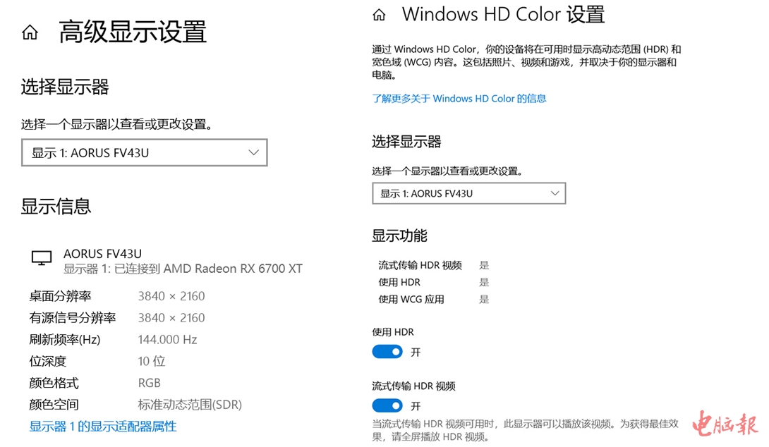 特别值得一提的是,AORUS FV43U支持HBR3,在使用经过HBR3认证的DP1.4线材时,总带宽达到了32.4Gbit/s,包括4K分辨率、144Hz刷新率、HDR1000显示效果以及10bit色深等多个特性都能同时支持,在显示效果上完全能做到“火力全开”。