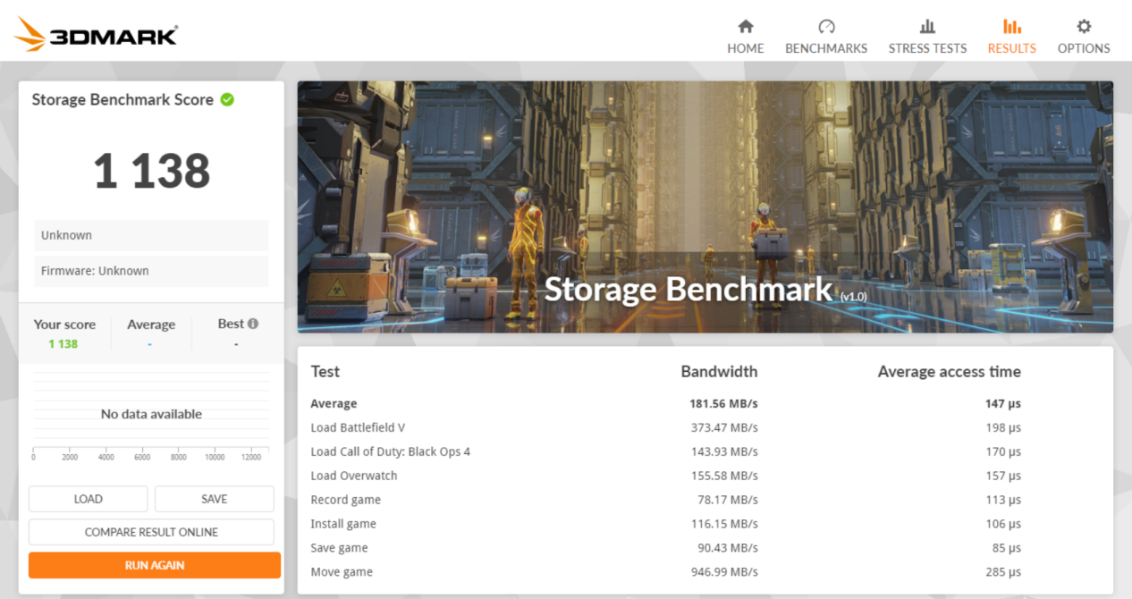 接着我们使用了3DMark的“存储基准测试”对Lexar ARMOR 700移动固态硬盘进行了考验。可以看到Lexar ARMOR 700移动固态硬盘的跑分成绩为1138,平均带宽为181.56MB/s,平均存取时间为147μs,这样的成绩在我们测试过的移动固态硬盘中,都算是名列前茅的,即使直接在这款硬盘里运行3A游戏也可以保证流畅。