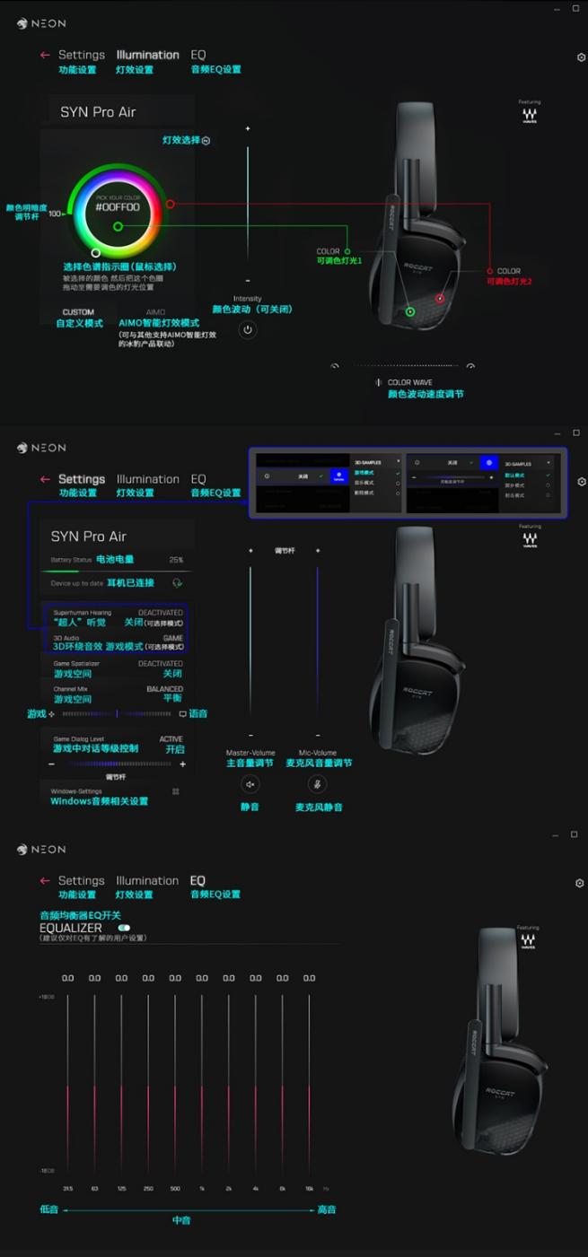 大概也认识到了Neon目前无本地化的不变,冰豹的官方旗舰店直接在Syn Pro Air耳机的详情页给出了Neon的设置项详细翻译。