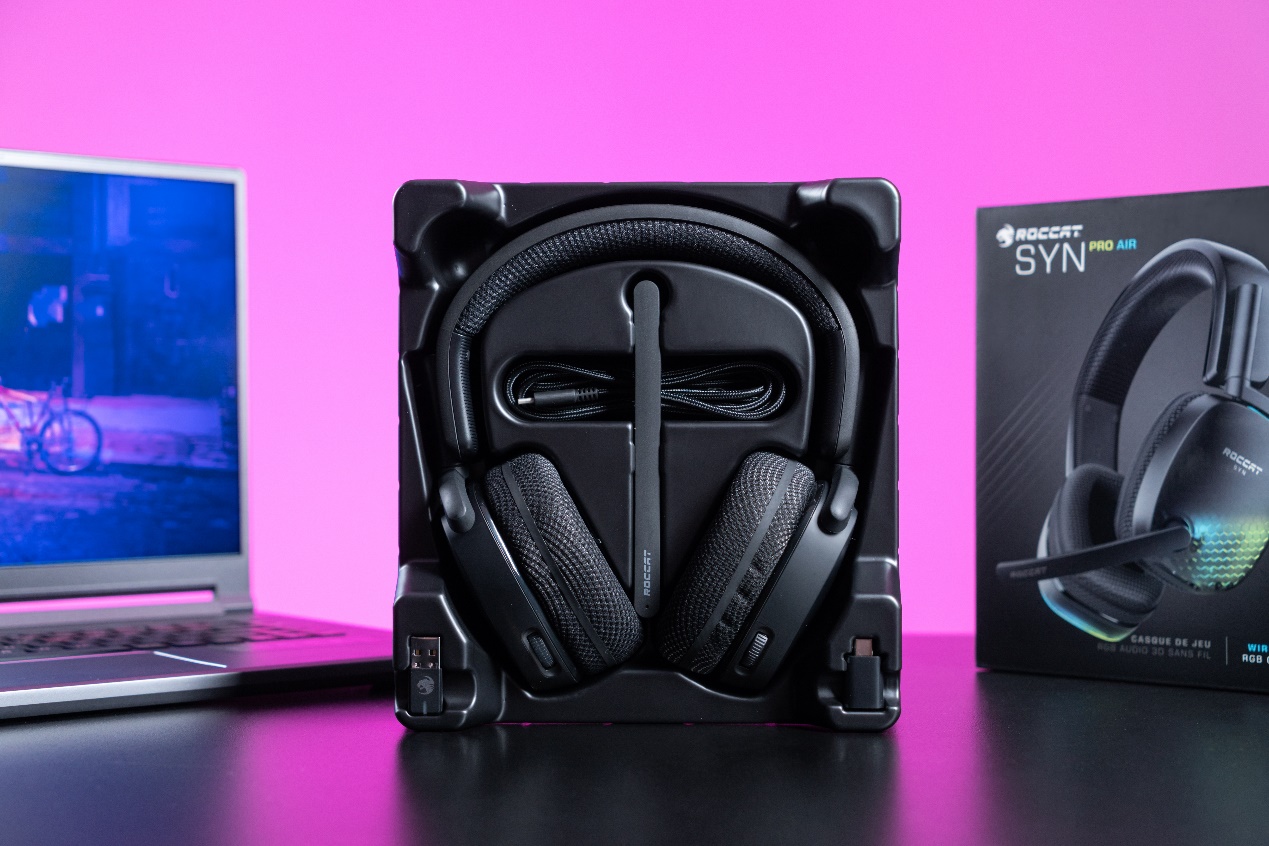 开箱后,Syn Pro Air的每个部分都颇有冲击感。全塑料头梁,但是并没有任何的廉价感,耳罩虽然方正,但在表面上隐隐有亚光光泽,以及在过渡曲线中凸显的那份冷峻棱角感。耳罩和头梁都覆盖着厚厚的、略带刮痕状的网状记忆海绵衬垫,给人一种很酷的安心感。