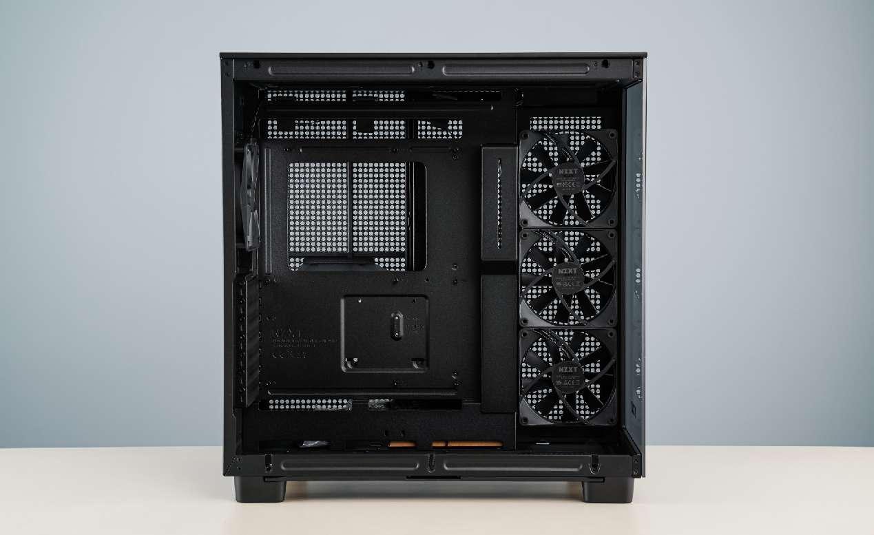 在此基础上,NZXT H9 Flow内部设置了多达10个120mm风扇安装位,在主板旁边以及背部自带4个F120Q风扇,自身风道已经得到了强化。同时丰富的风扇安装位还给安装水冷排提供了便利,机箱顶部、主板旁边以及底部位置均能支持360mm/280mm/240mm等多种规格的水冷排,对水冷散热器的支持非常的完善。个人觉得这种设计的最大意义在于可以根据自己的装机需求,灵活地选择水冷排的安装位置。