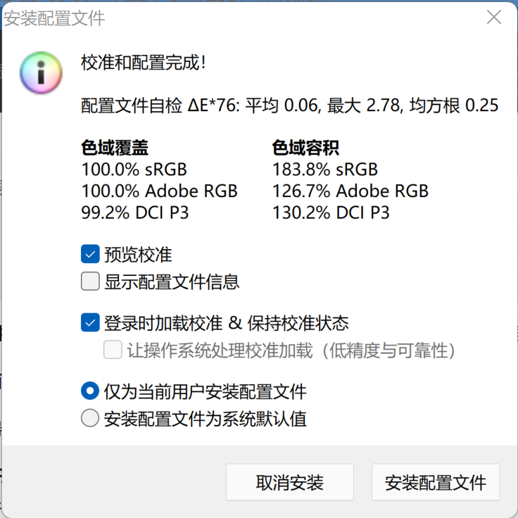 我们使用红蜘蛛SpyderX Elite对该显示器进行了实际测试,测试前先点亮显示器预热一小时。从测试来看,雕塑家MU156LO1便携显示器的实测色域容积可以达到183.8% sRGB、126.7% AdobeRGB和130.2% DCI P3,色域覆盖则为100% sRGB 、100% AdobeRGB和99% DCI-P3,在红蜘蛛的48色精准度测试中ΔE为0.6,跟宣传的水平相符,整体表现非常不错。