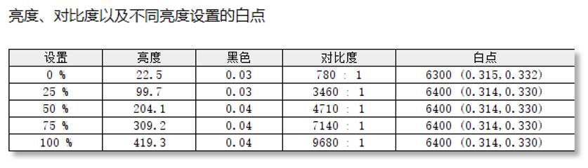亮度方面,该显示器的最高亮度为419.3nit,符合HDR400的标准。凭借OLED面板的特性,黑色趋近于0,对比度远超普通LCD面板的产品。在OSD中将该显示器设置为6500K色温,测得此时的显示器白点为6400K左右,非常接近D65标准值。色调响应方面,该显示器的测试曲线(黑色)非常贴合光度2.2标准曲线(青色),在各个亮度下都能很好的达到gamma 2.2标准值,整体的表现比较不错。