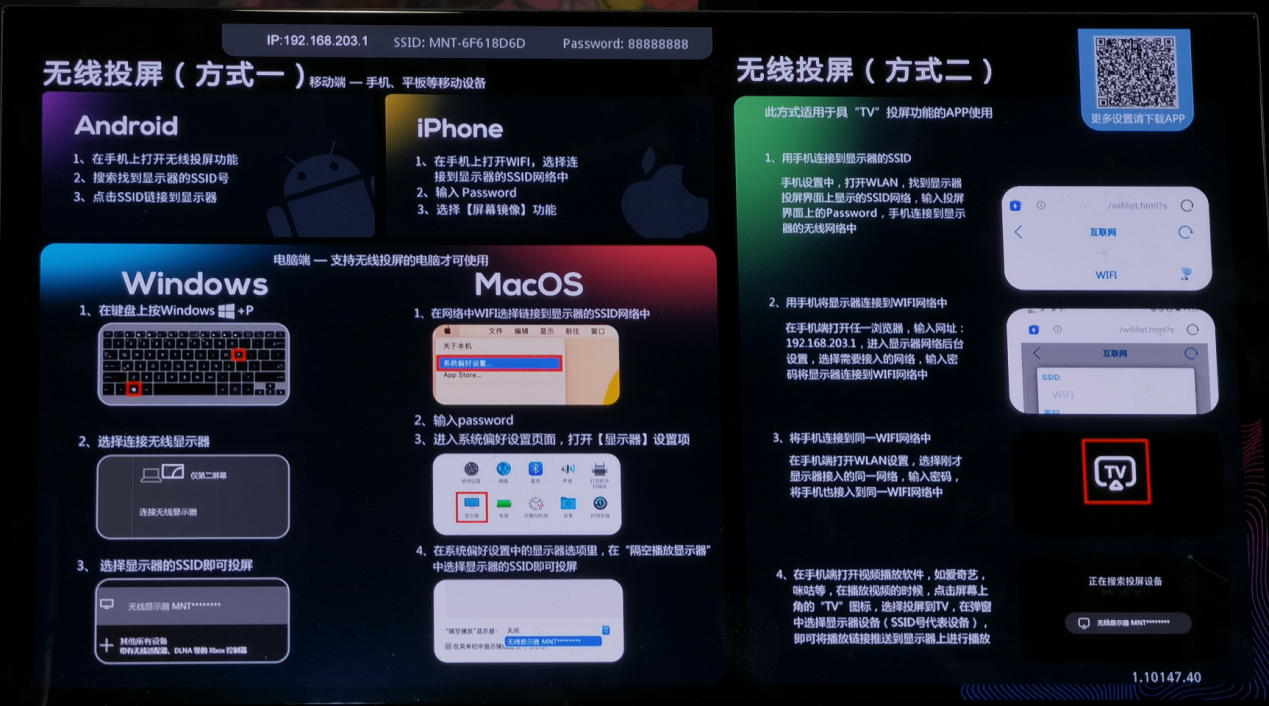 除了有线连接功能,雕塑家MU156LO1便携显示器还具备无线连接功能,进入OSD菜单选择无线连接按钮,即可进入EZ CastDual界面,该界面详细的说明了Android、iOS、Windows和MacOS下的无线连接方式,玩家只要跟着提示一步步操作即可顺利使用无线连接,还是比较方便的。