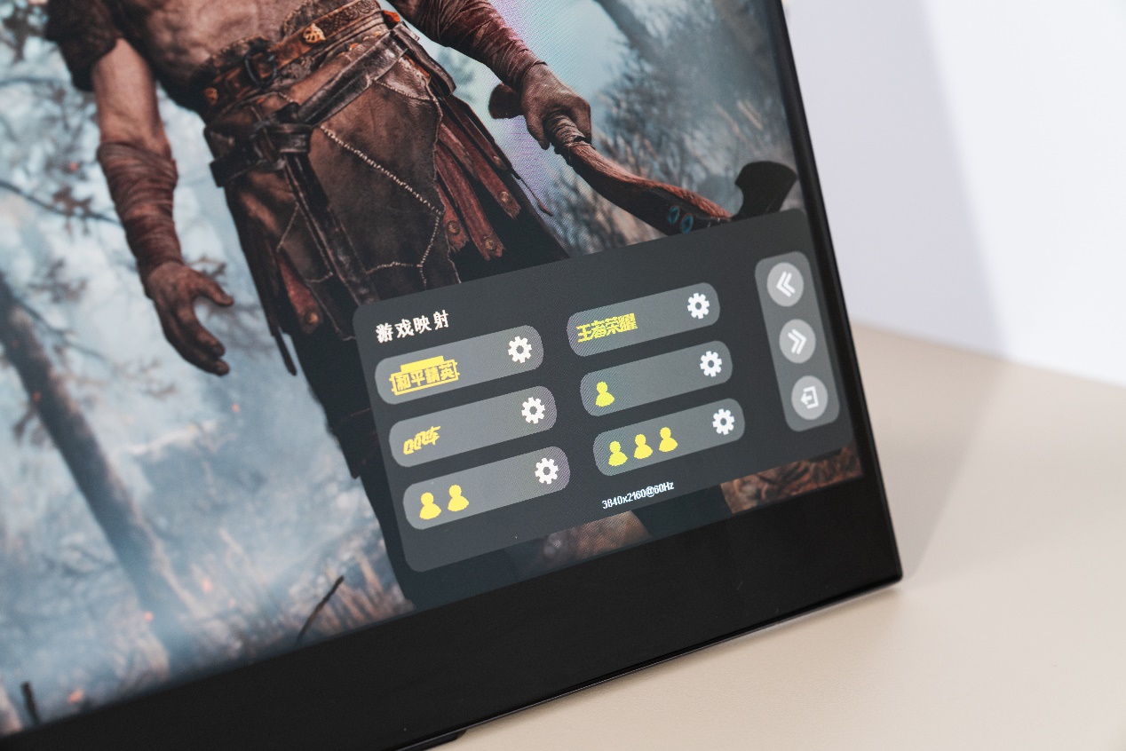 该显示器还配备了一个非常有意思的游戏辅助小功能,就是游戏映射功能,将键鼠连接到显示器上,再开启游戏映射功能,并在对应位置设置映射按键,就可以使用鼠标键盘来操控手机游戏,让手游也能拥有端游的便捷操作体验。游戏映射中预设了《和平精英》《王者荣耀》《QQ飞车》三款游戏的映射键位,玩家也可以通过设置自行调整,另外还提供了三组配置供玩家自定义配置。