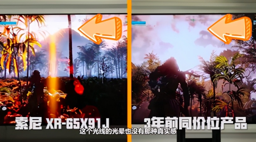 说了这么多,那么以游戏电视出圈的索尼X91J游戏体验感又如何呢?我们从三方面为大家解读。首先说色彩,以《地平线黎明时分》这款场景复杂的游戏来说,呈现色彩饱满的丛林场景对于电视来讲是一大挑战,普通电视呈现色彩艳丽却单一,抢眼却有些失真,而索尼X91J所呈现的色彩则更丰富,具有层次感,整体画面呈现也更加真实。