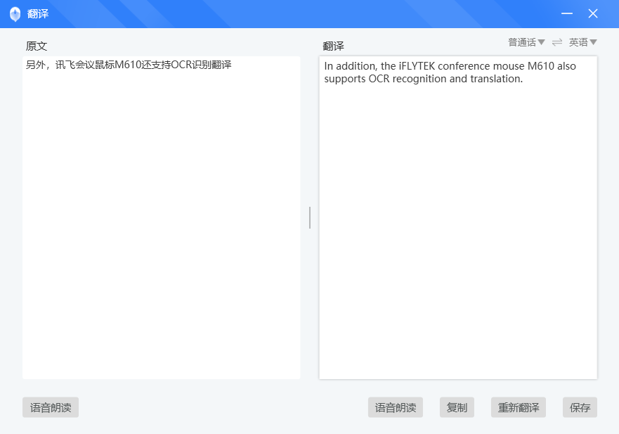 值得一提的是,双击语音键即可切换到翻译模式,可以将普通话直接翻译成英、日、韩、泰等多种语言并且直接输入到文本中。在以前,我们往往需要先打开翻译软件或者页面,将需要录入的文字逐一输入,在得到结果后再粘贴回文本框,操作十分繁琐,现在有了讯飞会议鼠标M610,不用任何第三方工具,直接可以一键搞定,太方便了。