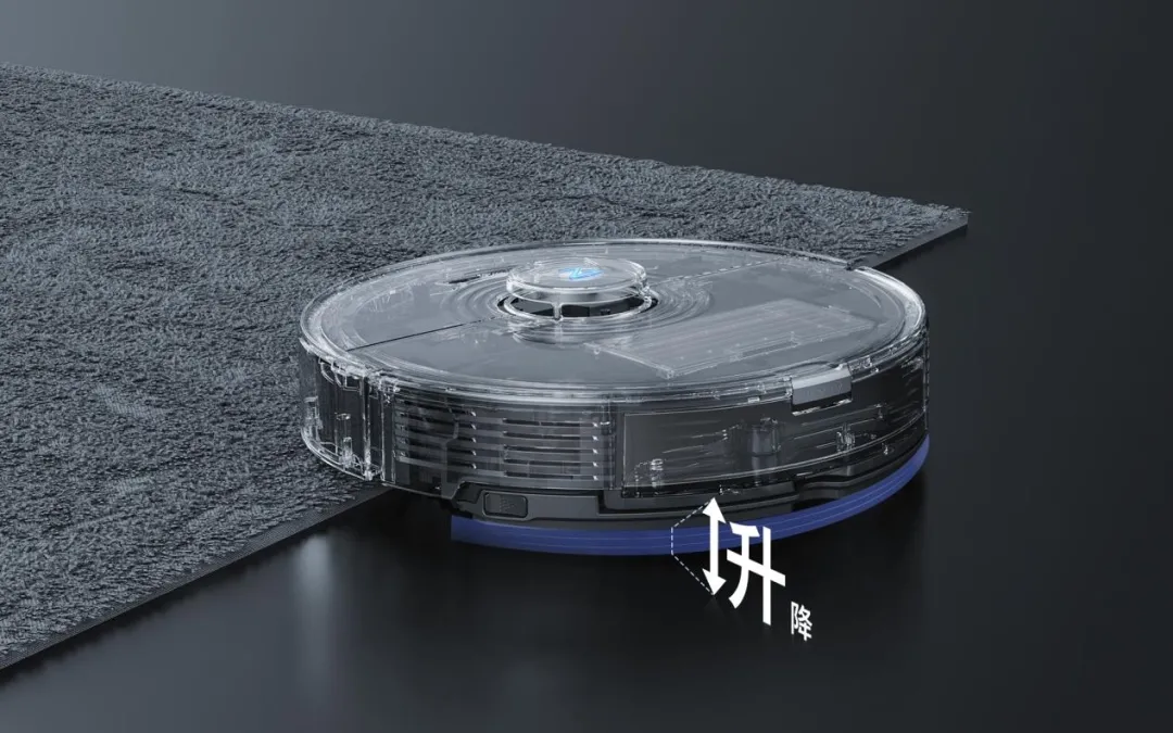 石头T7S系列搭载自动升降擦地模组搭配超声波地毯识别技术,遇到地毯时擦地模组会自动抬起,并停止震动与出水,使得地毯不会被拖布打湿;同时因模组自动抬起,机器人脱困能力得到增强,解决了回充时脏拖布对地面的二次污染问题。