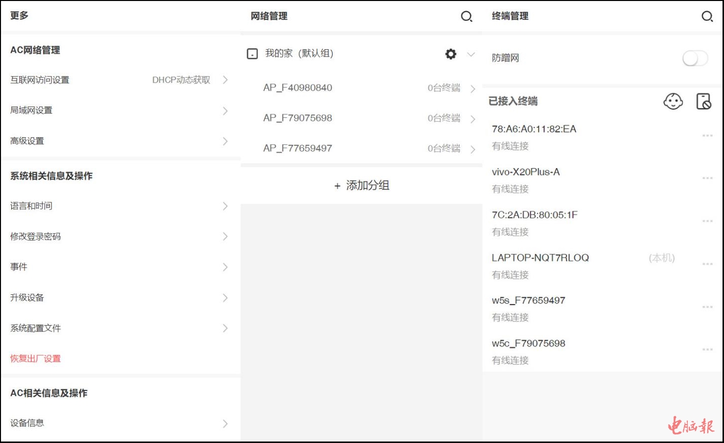其他设置方面,支持将不同位置或者用途的AP进行分组,比如卧室的AP面板和连接摄像头专用的室外AP可以单独分组并重命名,然后进入到每个AP里面查看所连接的无线终端,方便对不同的设备进行黑名单、限速等操作。有孩子的朋友也可以根据需求打开青少年模式,路由器网关会自动屏蔽掉内置黑面单中的各种不健康网站。另外在“更多”设置页面还可以进行修改登录密码,升级设备固件、恢复出厂设置等操作。