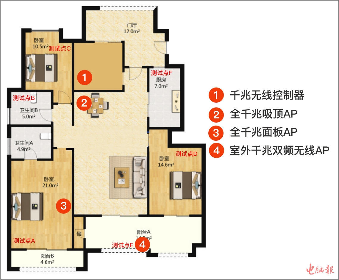 在快速安装调试完整套设备后,我们对它的信号覆盖能力进行测试。先介绍一下测试环境,测试环境是一套140平米左右的住宅,网络带宽为150Mbps,三室一厅两卫,户型图如下。吸顶AP位于客厅,面板AP安装在主卧,室外AP则安装在阳台的墙壁上。我们将在卧室、儿童房、厨房、卫生间以及客厅五个固定位置进行信号的测量,测试的设备为小米10手机,固定连接5GHz频段的WiFi。