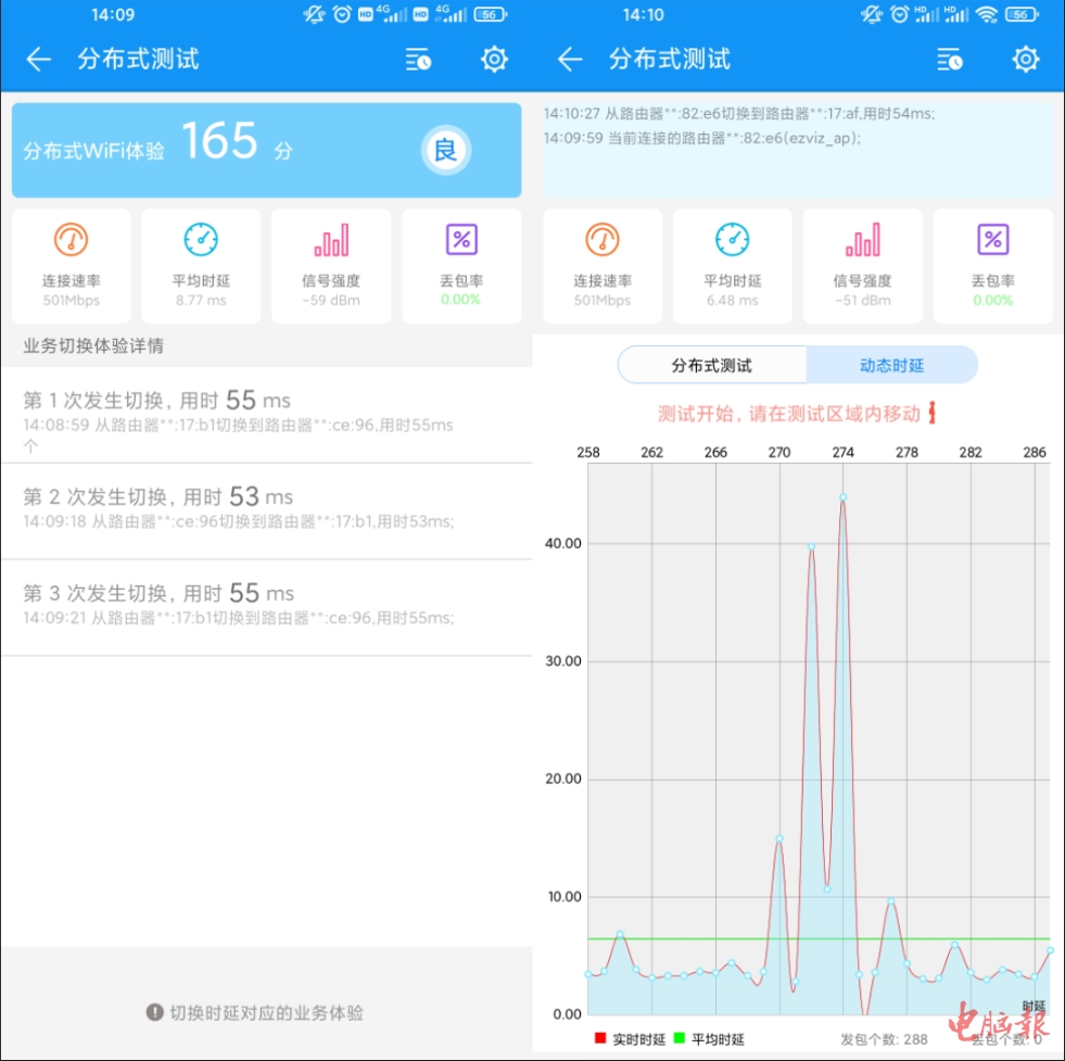 接下来,我们携带手机在屋内任意走动,模拟用户在家中不同区域使用无线网络,AP漫游的情况。可以看到3个AP的切换时间平均不到60ms,切换的过程中没有出现连接断开、丢包等情况,即使开一把《王者荣耀》从卧室走到阳台,期间的游戏延迟都不会有太大波动,证明这套AC+AP组网拥有不错的无缝漫游效果,基本不用担心WiFi信号切换的问题。