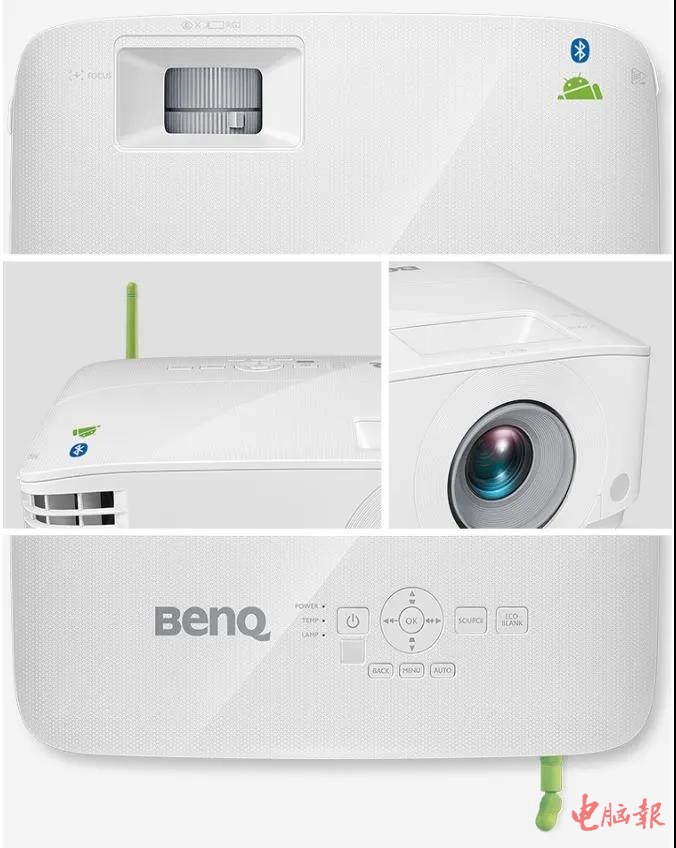 追求极致体验的明基E580:亲切且具有科技感!明基E580在外观上延续E系列一贯以来的设计风格,圆润的边角和弧线型散热栅孔设计,亲切且具有科技感,深灰色品牌字样则有效提升了产品质感。机身顶部设有上/下/左/右、确定、信号源、智能省电模式、电源开关、返回、主菜单、自动等十一个按键,符合人体操作习惯的按键位置,让用户能快速上手。