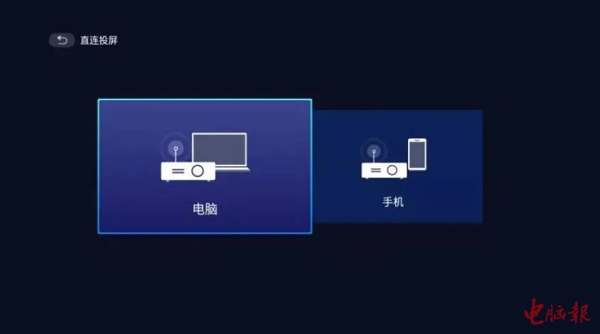 直连投屏子界面提供“电脑投屏”和“手机投屏”两个选择