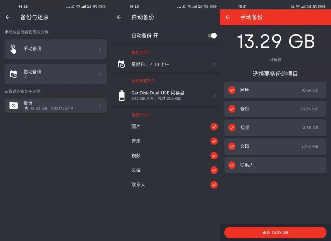 它的另外一个实用功能是备份,它可以自动将手机中的照片、视频、音乐等文件备份到U盘中,而且不会改变原有的目录结构,一些保存在软件文件夹中的文件都能无缝备份和还原。我们这里进行了一次手动备份,备份的文件大小为13GB,一共耗费了16分钟的时间,比用无线传输的“一键换机”快上不少,如果嫌手动太麻烦,也可以设定计划备份任务,到时候插上U盘自动运行,相当于又给手机上了一重冷备份保险。