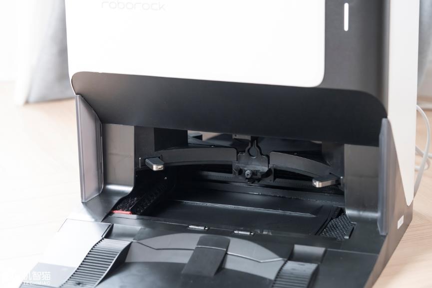 开始我只是觉得挺奇特,后来发现这设计其实很科学。清洗完成之后,调转方向拖布模组朝向底座外部,再加上斜坡板的倾斜设计,拖布处于悬空状态,通风效果更高,也不需要像以前的扫拖机器人下面充电时要垫个防水垫了。拖布和充电触片位置相反,安全性自然也更高。