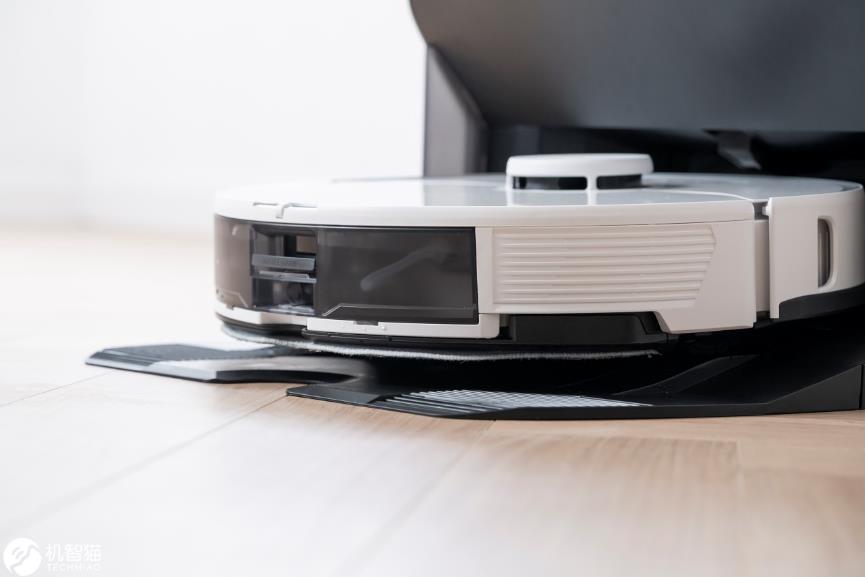拖地部分采用可升降模组,最高可升起5mm,搭配底部的超声波地毯识别传感器,在识别到地毯的时候,拖布支架自行升起,只吸尘而不拖地毯。同时开启最大吸力,藏在地毯缝隙的碎屑、毛发都被清干净。