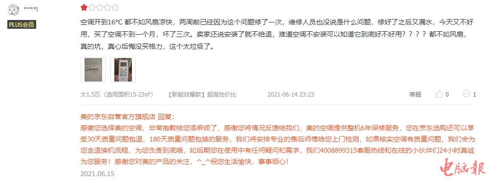 但这一切都不是美的在配置和售后服务上打折的理由,消费者选择购买,就是对品牌的认可,任何产品都不能因为销量高,就只管售,不管后,特别是这种季节性产品,消费者购买之后,几个星期都不消停,夏天都过半了,为什么还要选择美的呢?