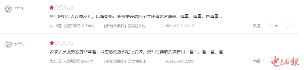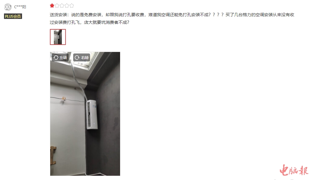 投诉后,商家却以已经安装为由拒绝退货。这不就陷入死循环了吗,空调只有安装并且使用后才能发现问题,但是却因为“已安装”就不能退货,这样的售后政策的确让人匪夷所思。