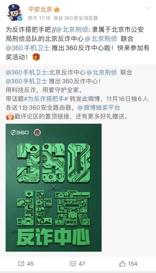 据悉,本次直播活动是360反诈中心及北京反诈“守”卫安全季第一期,购物季防骗专题的主要内容,此前,360手机卫士官方发布了其与北京反诈中心联合推出的“360手机卫士反诈中心”,此次合作,是反诈中心首次融入到一款大众化的网络安全产品中,既是反诈举措深入民间的具体行动,也是警企合作共同普及反诈的典范。