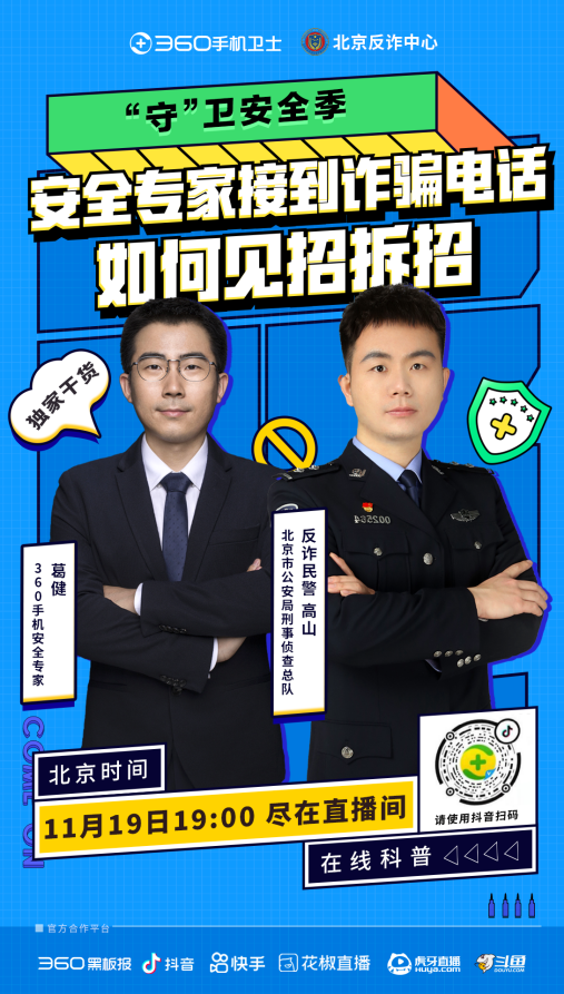 双十一和双十二期间是每年的购物旺季,同时也是购物类诈骗、冒充客服等诈骗高发的时段。为了帮助广大网民防范购物方式、购物环节中可能遇到的风险,更加有效的保护个人信息和隐私,11月19日,360手机卫士联合北京反诈中心共同推出一档直播节目,以防范网络购物诈骗为主题,为广大网民上了一堂别开生面的反诈科普课。此次直播节目邀请到360手机安全专家葛健及北京市公安局刑事侦查总队反诈民警高山两位嘉宾,节目全程将在抖音、快手、花椒、微信视频号、虎牙、斗鱼平台同步直播。