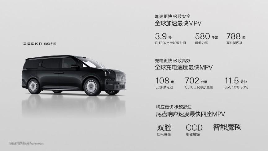 极氪009光辉,同时做到了最极致的快和最极致的慢。极氪009光辉是全球加速最快的MPV,零百加速仅需3.9秒;全球充电速度最快的MPV,搭载5C麒麟电池,SoC从10%充至80%,仅需11分半,增加续航里程超过500公里;全球底盘响应速度最快的四座MPV,搭载CCD电磁减振和双腔空气悬架的智能魔毯底盘,可以在毫秒间,调节悬挂软硬,时刻保持车身平稳,极致舒适媲美百万级超豪华车。