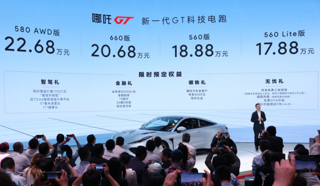 4月18日,第二十届上海国际汽车工业博览会(以下简称“上海车展”)在国家会展中心拉开帷幕。车展上,哪吒汽车举办了“开启跑车新纪元”哪吒GT上市发布会,旗下首款纯电跑车哪吒GT震撼上市,上市车型包括560 Lite版、560版、660版和580 AWD版,官方指导售价为17.88-22.68万元。发布会上,哪吒汽车联合创始人、CEO张勇公布了哪吒GT限时购车权益——5月31日前,在哪吒汽车APP等官方平台下定哪吒GT,即可享受:价值10000元的“智驾升级包”,8000元/台金融贴息,以及包括终身免费三电质保、免费OTA升级等在内的多重福利。此外,对于一直支持哪吒汽车发展的老车主,哪吒汽车将额外提供5000元购车礼金。