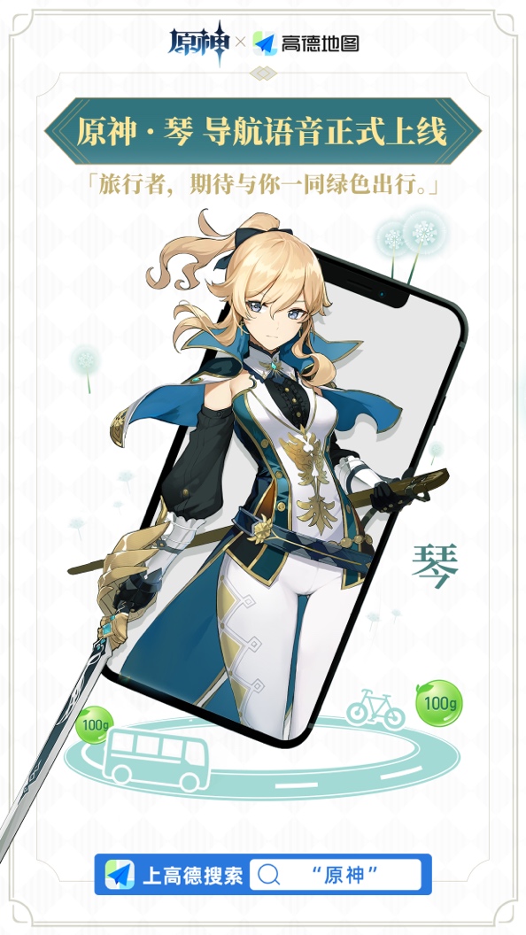 此外,本次“绿色出行-碳普惠”平台多地上线之际,高德地图还推出了与《原神》深度合作的绿色出行特色导航语音——“蒲公英骑士”琴,鼓励引导健康低碳出行,即日起用户在高德地图中搜索“原神”即可下载体验。