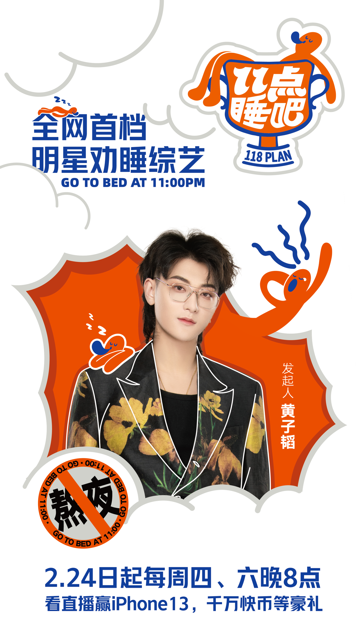 为早睡困难症开方,快手娱乐制作全网首档明星劝睡综艺《11点睡吧》,喊出“high什么high,早点睡”口号,聚焦睡眠健康,推出明星睡眠挑战。黄子韬将作为领睡人,邀请16位艺人嘉宾与8位快手达人组成“想睡挑战团”,角逐大睡神杯。