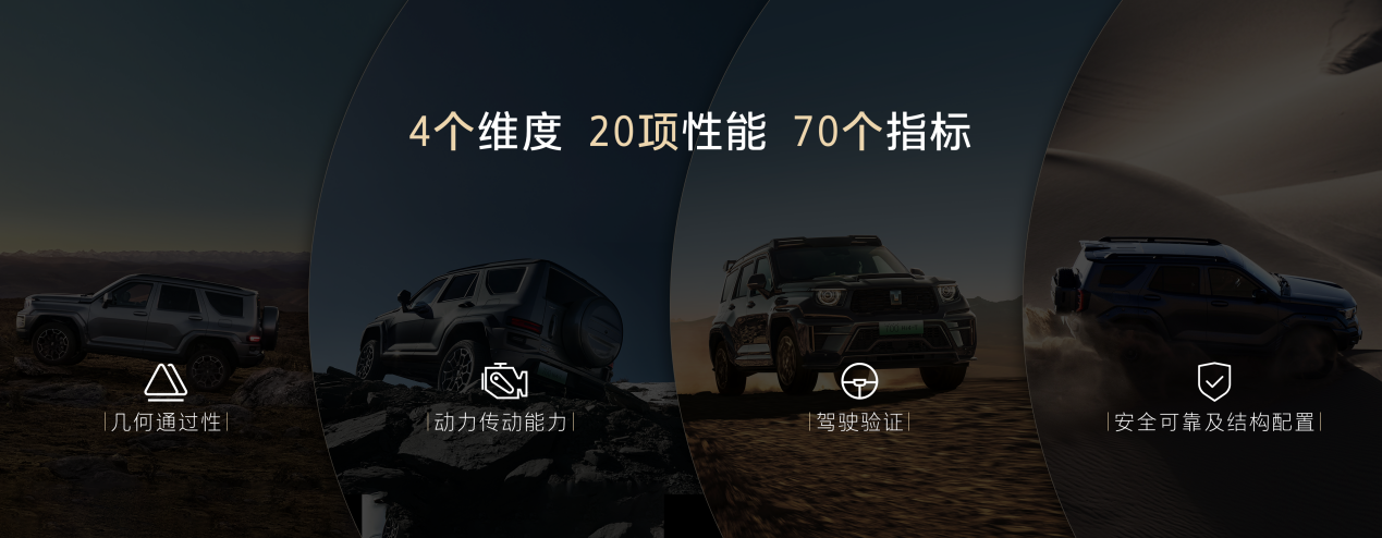 长城汽车副总经理李树会介绍道:“长城汽车基于34年造车经验沉淀下来的越野基因,及400万台越野车行驶数据,通过数据迭代及用户的真实反馈,构建了一套虚拟仿真+场地延展的越野能力评估模型,并提炼出来越野用户高频用车场景:山地、沙漠、雪地与泥地四种单一场景及综合穿越复合场景。”