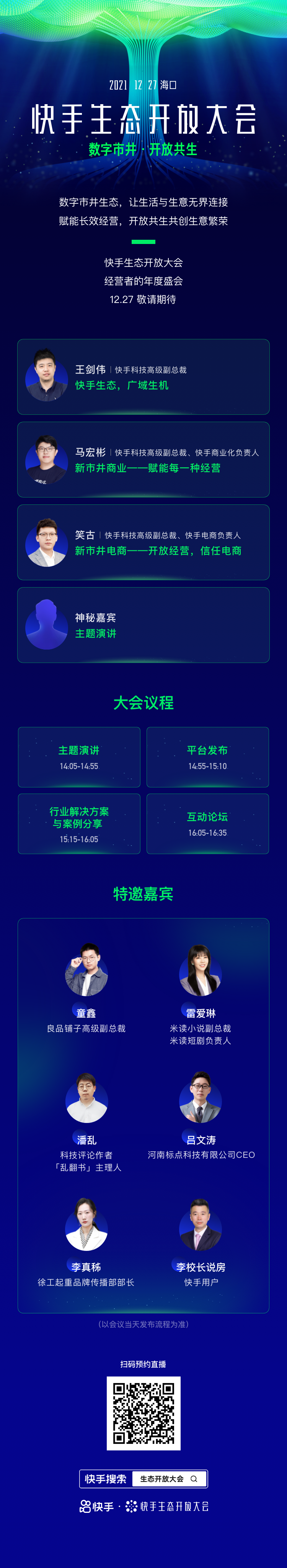 快手高级副总裁王剑伟,快手科技高级副总裁、快手商业化负责人马宏彬,快手科技高级副总裁、快手电商负责人笑古将在大会现场分享,快手各业务对开放生态的看法、实践以及对经营者的持续赋能。