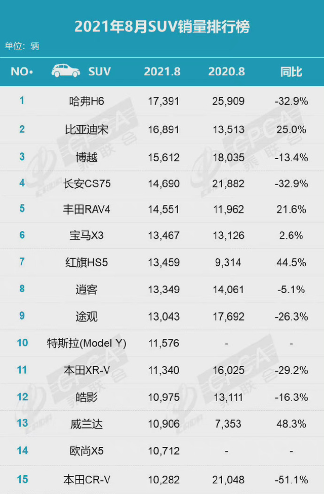 因为芯片和供应链的问题,本应增长的国内车企销量也是不增反减。乘联会数据显示,2021年8月中国乘用车市场零售为145.3万辆,同比下降14.7%,相较2019年8月还下降了7%,总体不增反减。而在SUV领域上,此前霸占榜单前列的多款车型销量相比上月也是急转而下。