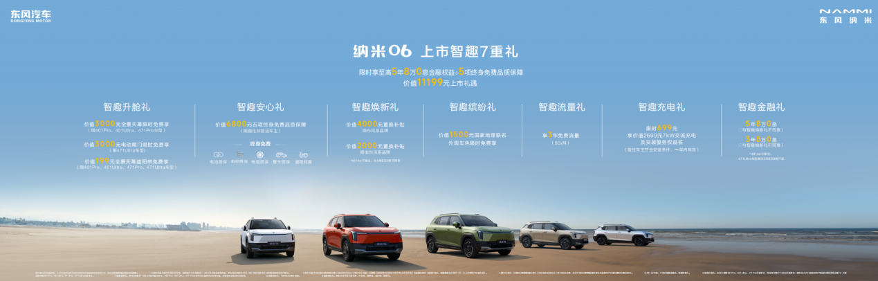 东风纳米品牌致力于成为“国民纯电普及者”,在首款车型东风纳米01上市一年以后,第二款车型东风纳米06也于5月27日正式上市,新车共推出了五款配置,以7.99万-10.99万元的限时先享价切入A0级纯电SUV市场,并带来了电动尾门和全景天幕限时送、五项终身免费品质保障、中国国家地理联名外观车色限时免费享、最高4000元置换补贴等超值礼遇,以科技平权、超大实用空间及亲民价格直击家庭用户核心需求。