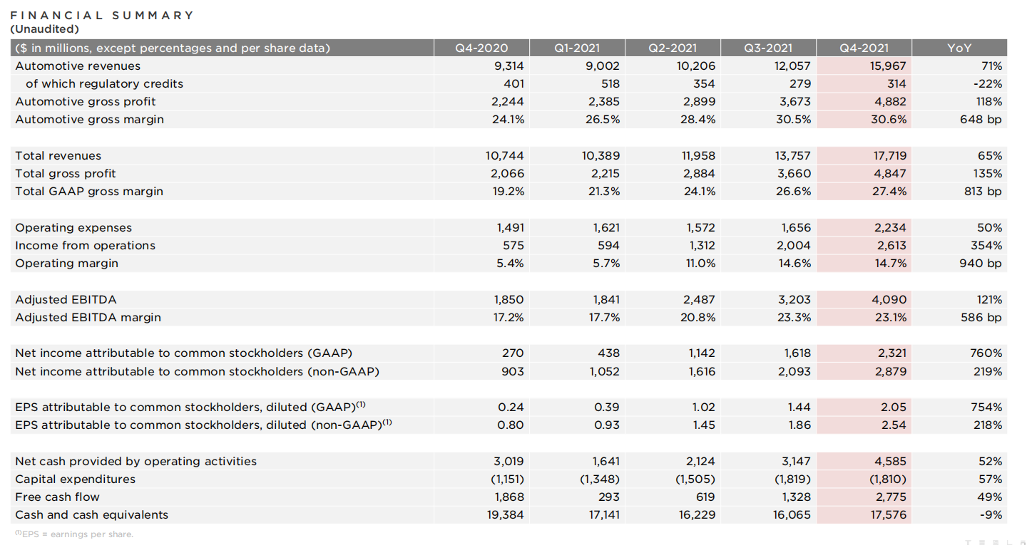 2021年第四季度,特斯拉总收入达177亿美元,同比增长65%,GAAP营业利润为26亿美元,实现了14.7%的营业利润率。GAAP净利润为23亿美元,同比增长760%,非GAAP净利润(未计股份支付费用)为29亿美元,创造历史新高。