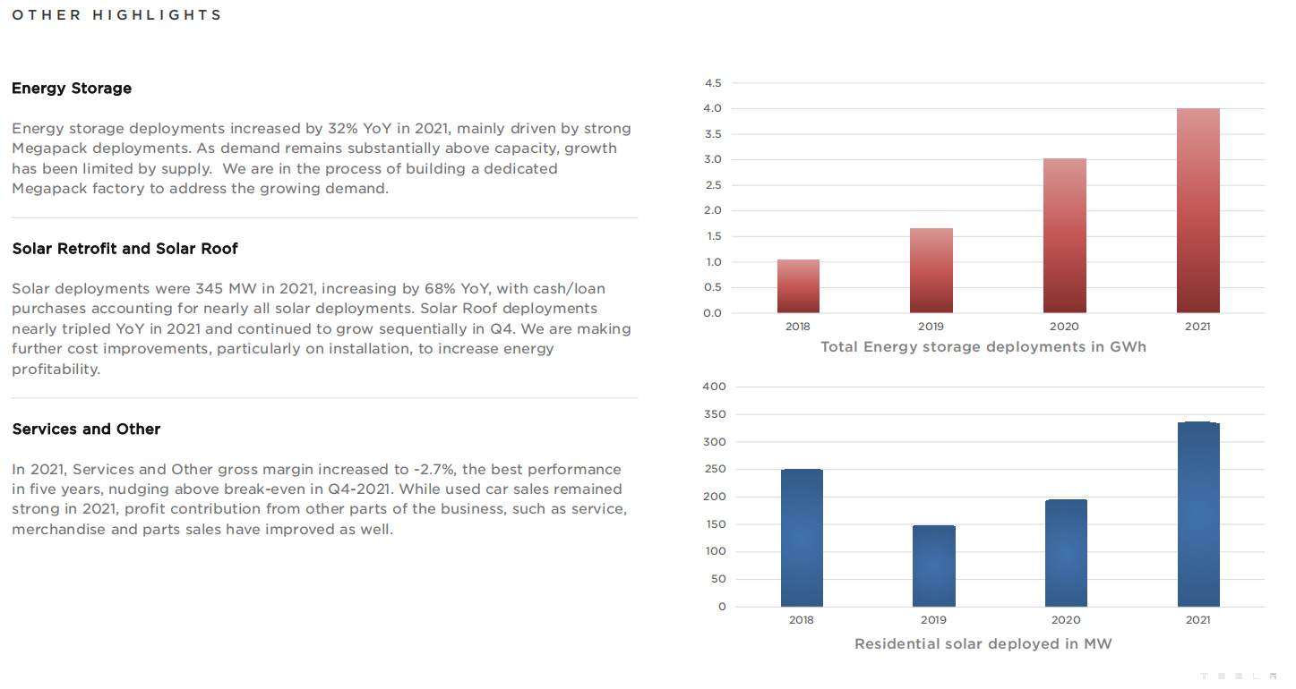 得益于储能产品Megapack的强势驱动,我们在2021年的储能产品装机量同比增长32%。由于市场需求仍持续高于产能,储能业务增长受到了供应限制。我们目前正在建设一座工厂专门生产Megapack产品,以满足日益增长的市场需求。