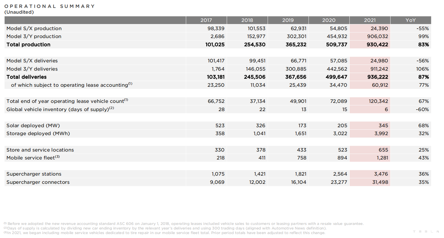 解读:2021年第四季度,特斯拉依然面临全球供应链、物流运输、劳动力和其他生产制造方面带来的挑战。尽管重重限制下特斯拉的工厂已经连续多季度低于产能运行,但2021年特斯拉再次创造生产纪录,这也让特斯拉攀上全年约94万辆的交付新高峰。