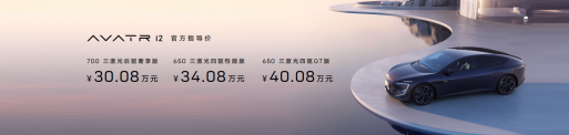 在发布会现场,梁朝伟和谭本宏共同公布了阿维塔12官方售价,其中700三激光后驱奢享版 30.08万元, 650三激光四驱性能版34.08万元, 650 三激光四驱GT版40.08万元。阿维塔同步开启正式订购,用户可到阿维塔APP一键下单。