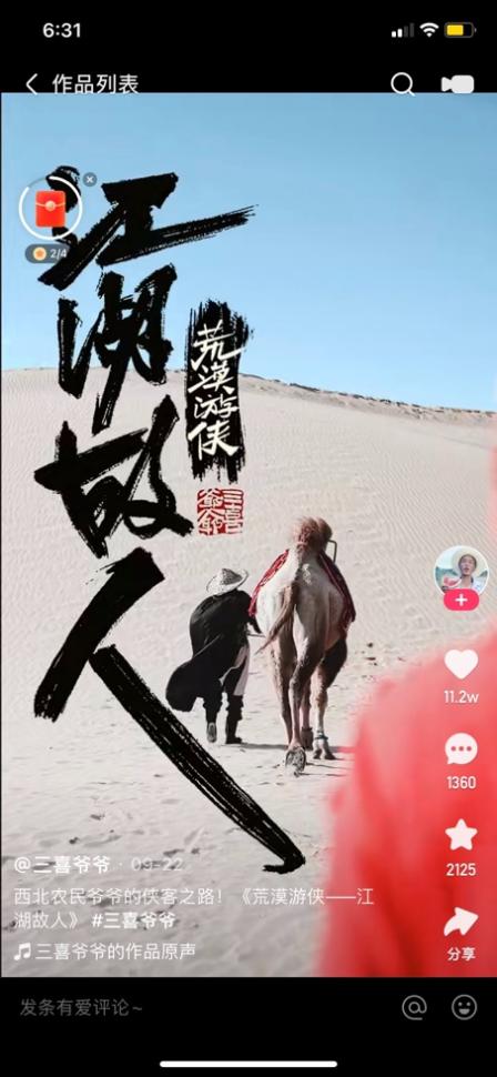 大漠孤烟,赤日炎炎,一位侠客仗剑而来,脸庞冷峻,着一袭战袍,牵一匹骆驼,背影苍凉。而在视频的上一秒,这位侠客还是在玉米地里侍弄庄稼的寻常老人,白色汗衫配西瓜红背心,戴顶草帽,佝偻着身躯,一回头,冲儿子的镜头憨厚地笑。
