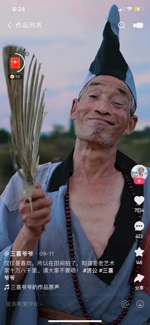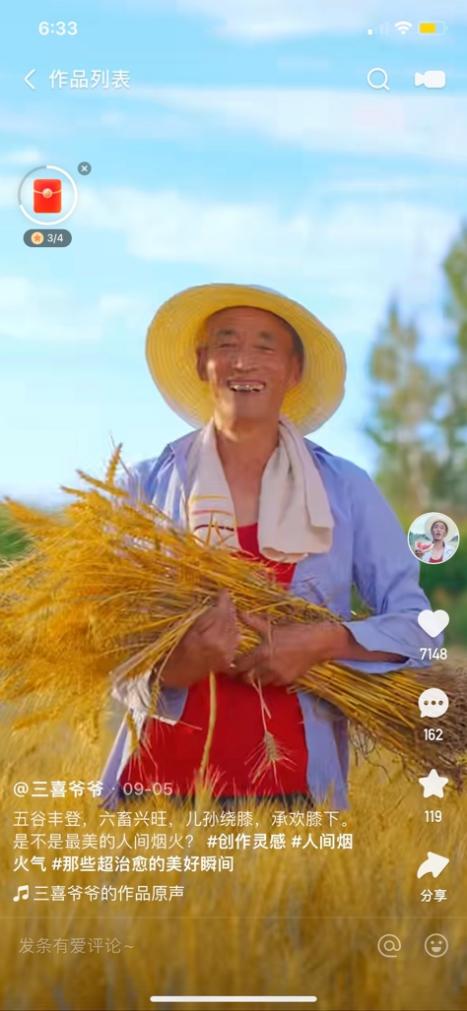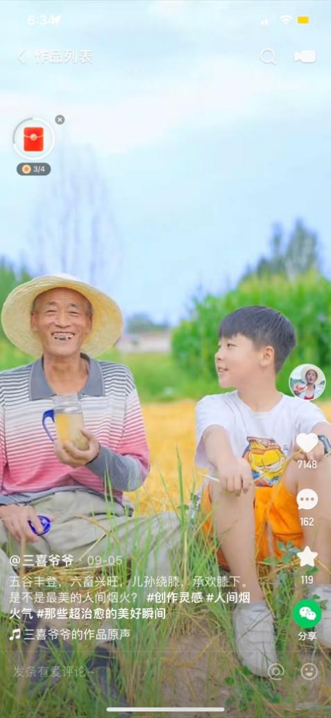 让三喜爷爷开心的还不止这些。他发现,自从拍短视频以来,他和儿子之间的话也变多了,从前的孤单也消解了不少。之前儿子回家后大多时间都是躺在床上玩手机,和他聊天也就是说说工作上的事儿,他不太懂也说不上几句。但现在,他可以和儿子聊下次拍什么造型、扮演什么形象、背景地点选在哪里。三喜爷爷还经常让儿子推荐自己可以演绎的某类角色的相关电影,“我看了就知道咋演了”。他在视频中表达自己非常享受现在的美好生活,同时爷爷也在思考,可以为自己的村子、为乡亲们做些什么。