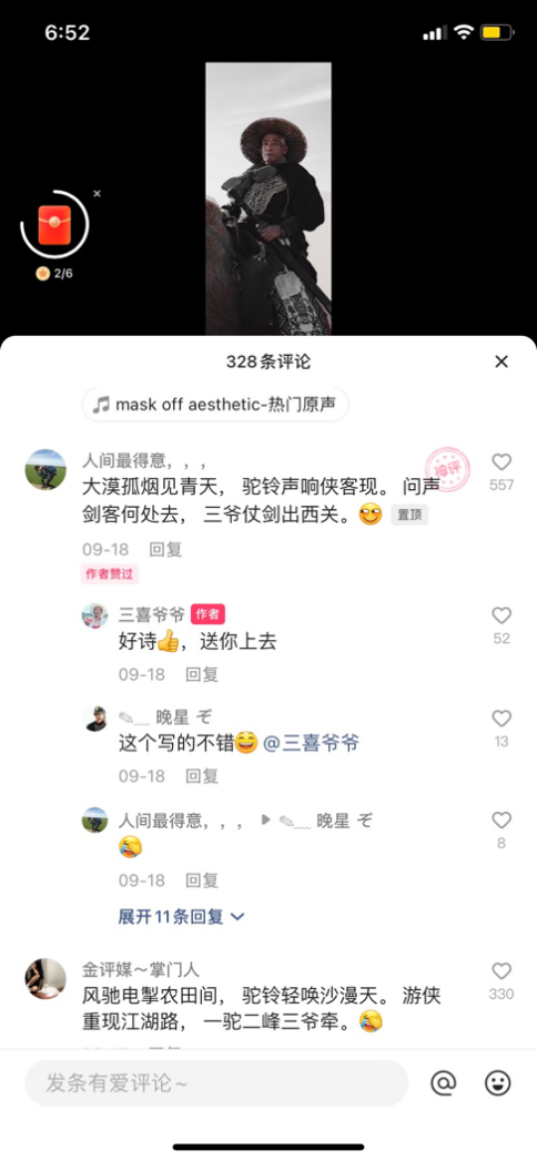 意外走红后,快手上有诸多网友为三喜爷爷点赞留言,上万条评论,爷爷都会仔仔细细地一一阅读。张建宗记得,有一天他当时正在兰州工作,父亲给他打电话来说,有人在他的快手视频底下给他留言,“写了首诗,写得还不错”,那首诗现在父亲还能背出来,“大漠孤烟见青天,驼铃声响侠客现。问声剑客何处去,三爷仗剑出西关”。