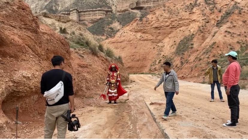 济公是三喜爷爷钟爱的人物形象,十年前,在村里的社火表演中,三喜爷爷就扮演过济公,还曾在脸上抹上黑鞋油、手里抓着铁链子扮演西北社火中独有的形象“瓜娃子”。可惜村里已经近十年没有过社火表演,这种非物质文化遗产渐渐从民间生活中淡出;还好,三喜爷爷对表演的热情又再一次被短视频点燃。